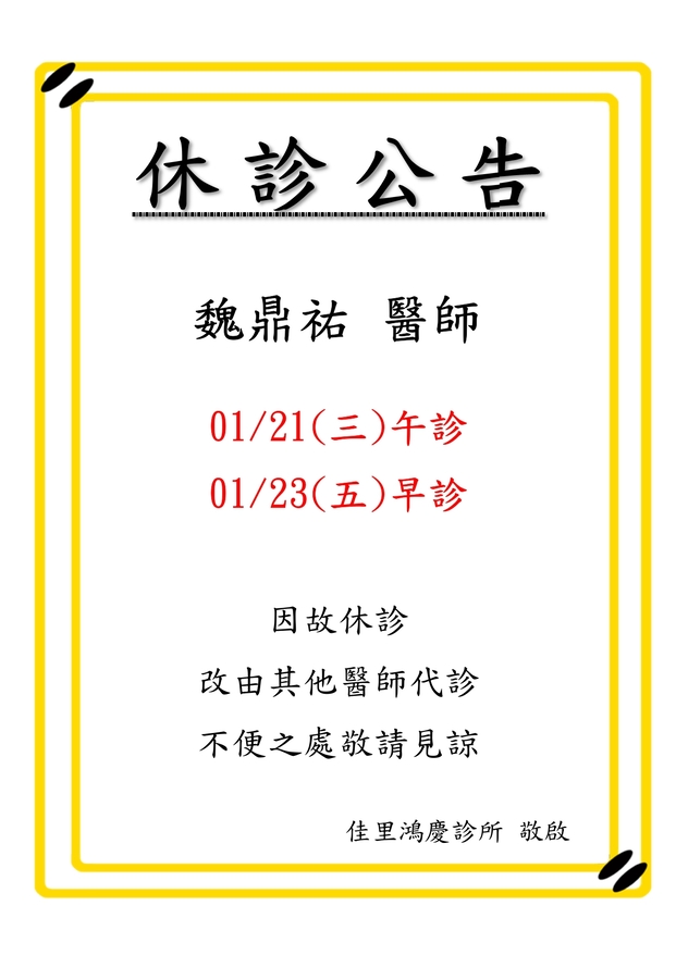 115/01/21及01/23魏鼎祐醫師休診公告