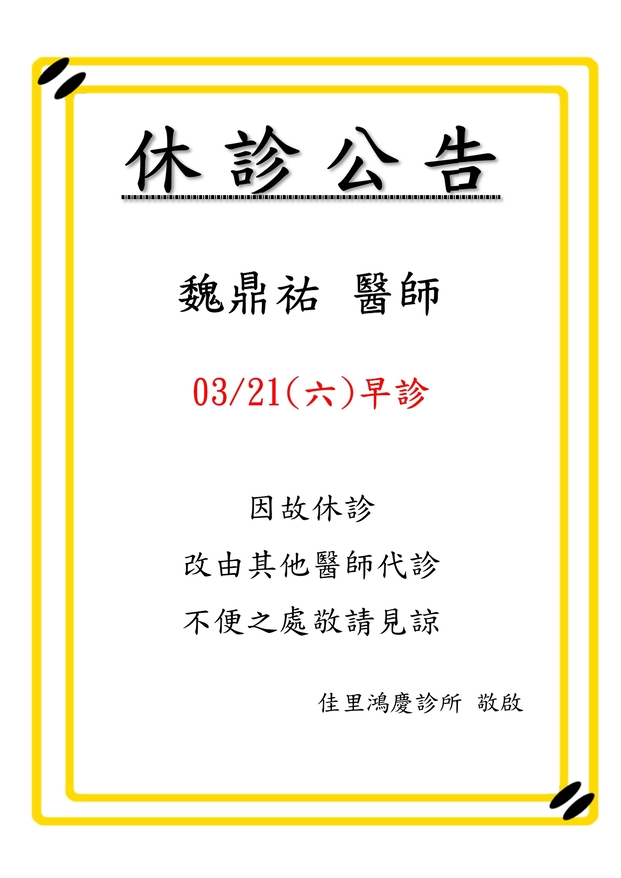 115/03/21魏鼎祐醫師休診公告
